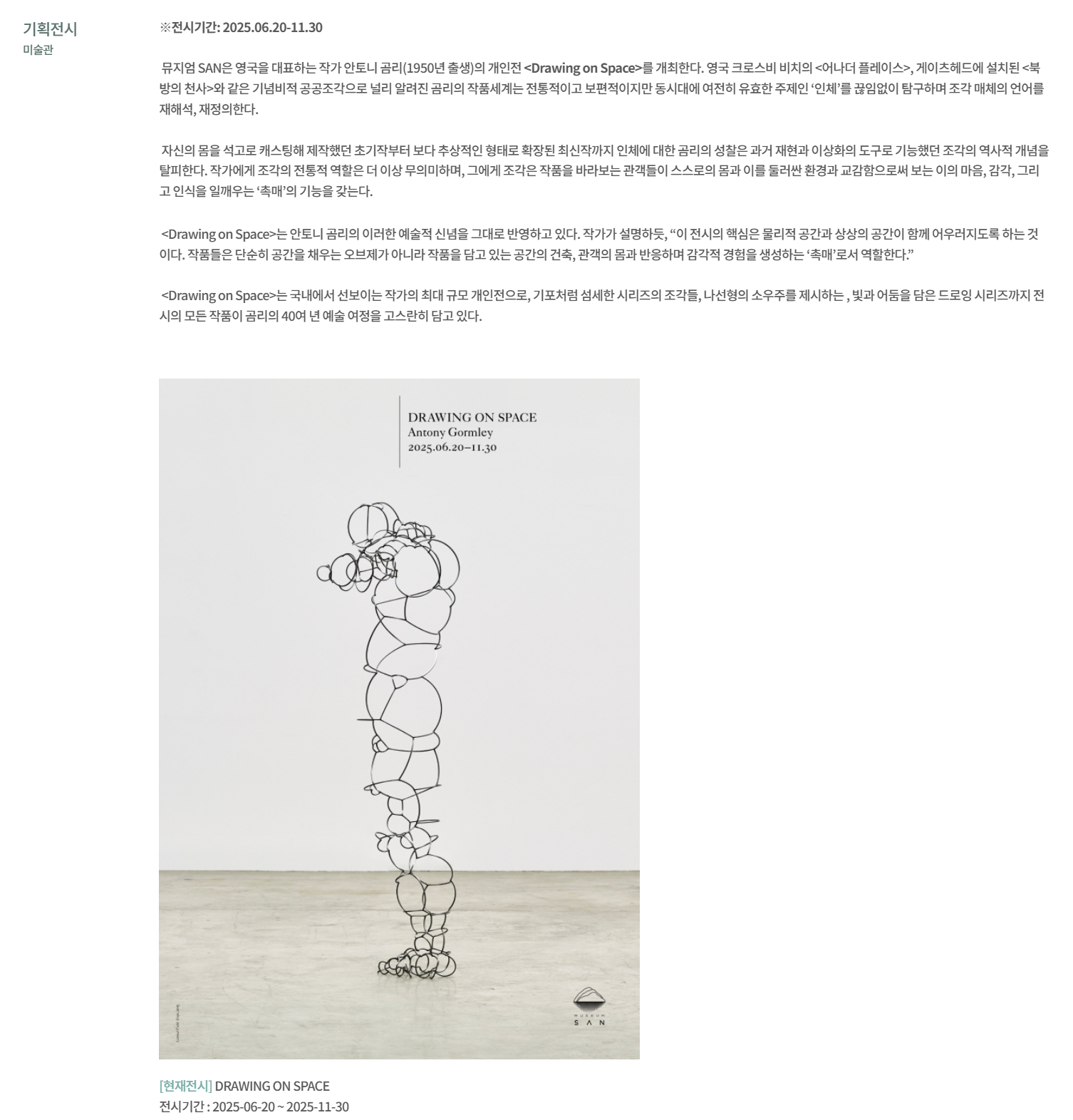 원주 뮤지엄 산에서 열리는 안토니 곰리의 최대 규모 전시입니다.