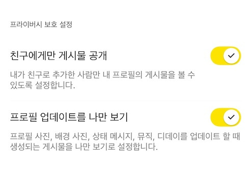 - 프로필 업데이트를 나만 보기 → 프로필 사진, 배경 사진, 상태 메시지, 음악 업데이트 시 남의 피드에 노출되지 않음