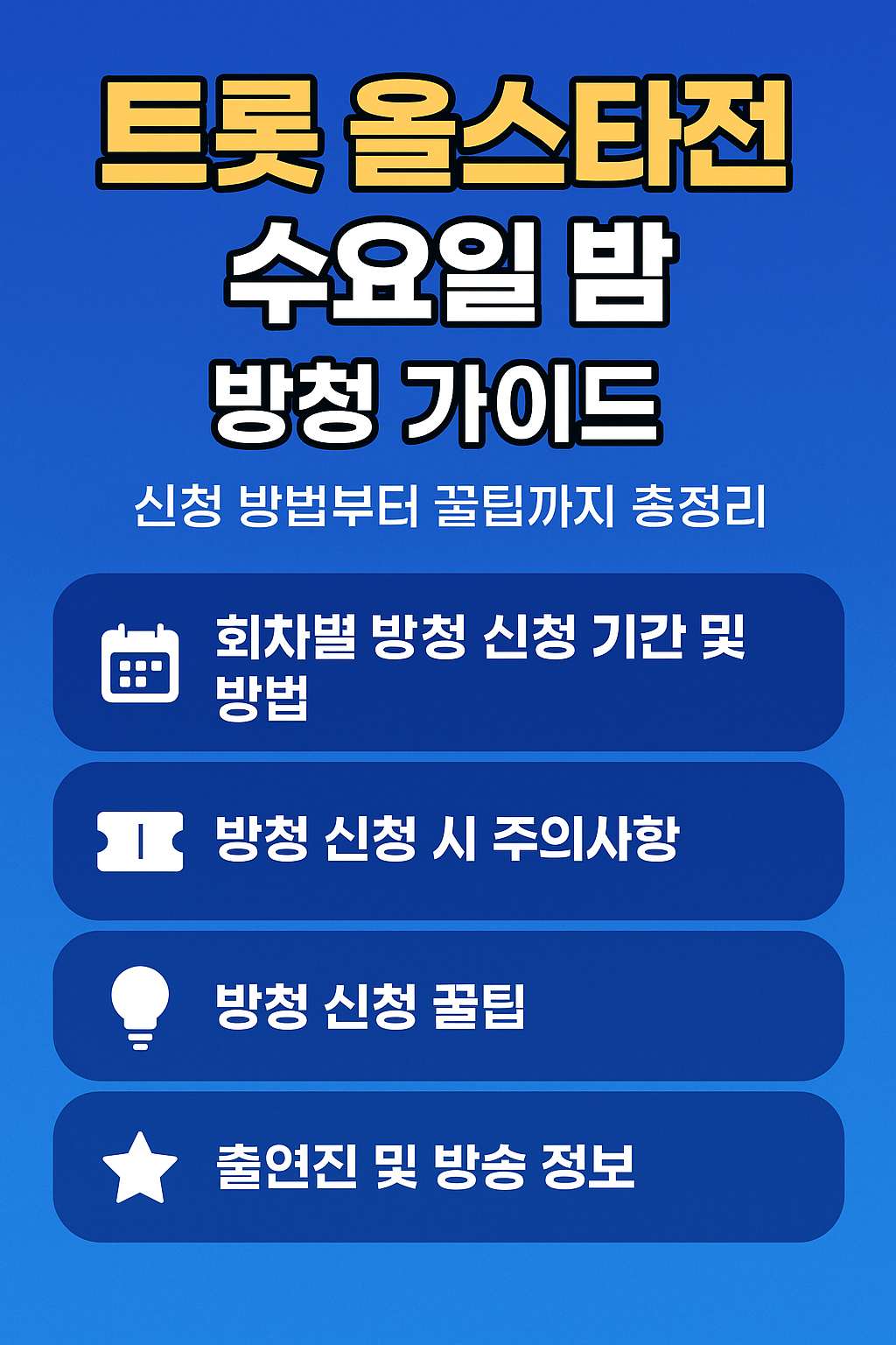 트로트 팬이라면 놓칠 수 없는 프로그램, 바로 '트롯 올스타전'입니다. 매주 수요일 밤, 최고의 트로트 스타들이 펼치는 무대를 직접 관람하고 싶다면, 방청 신청 방법과 주의사항을 꼼꼼히 알아두어야 합니다. 이번 글에서는 방청 신청 방법, 주의사항, 꿀팁, 회차별 신청 기간, 출연진, 채널 정보, 재방송 시간까지 한눈에 정리해드립니다. ---