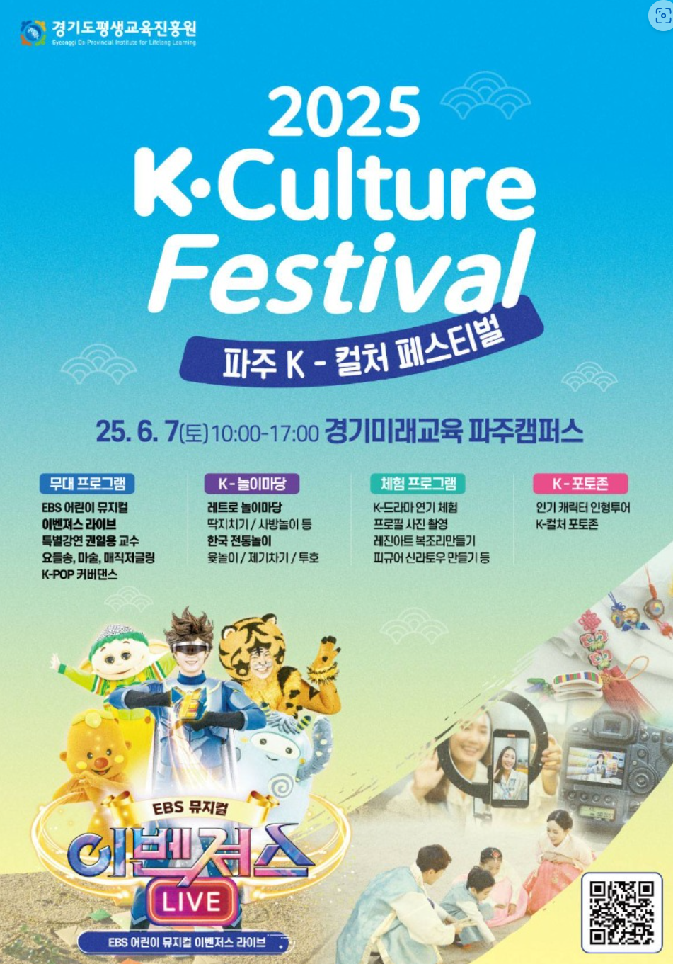 2025년 6월 7일 단 하루! 한류 팬이라면 절대 놓칠 수 없는 K-컬처 종합문화예술축제가 경기미래교육 파주캠퍼스(구 파주 영어마을)에서 열립니다. 파주 케이컬처페스티벌은 K-POP, K-드라마, K-뮤지컬, K-뷰티, K-푸드 등 다양한 K-콘텐츠를 한자리에서 즐길 수 있는 특별한 행사입니다.