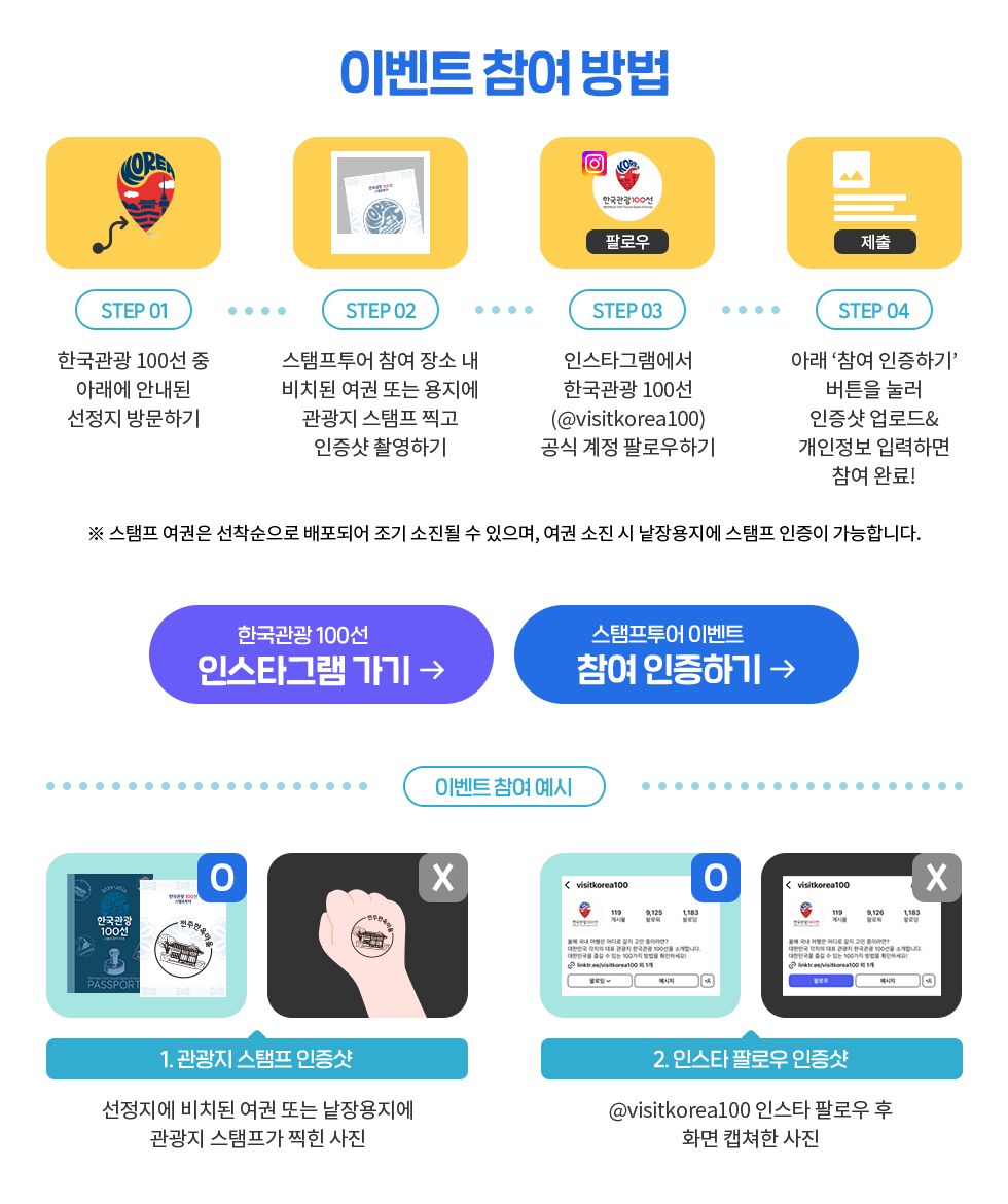 관광지 스탬프 비치 장소(홈페이지 팝업 확인)에서 스탬프나 사진 인증. 용지 소진 시 기타 용지 사용 가능.