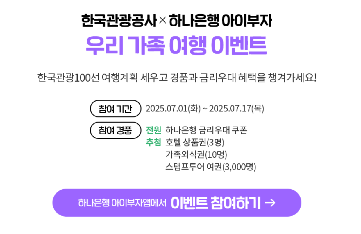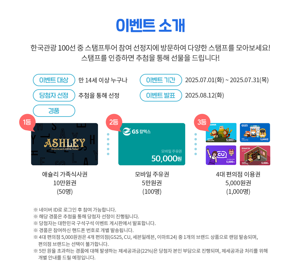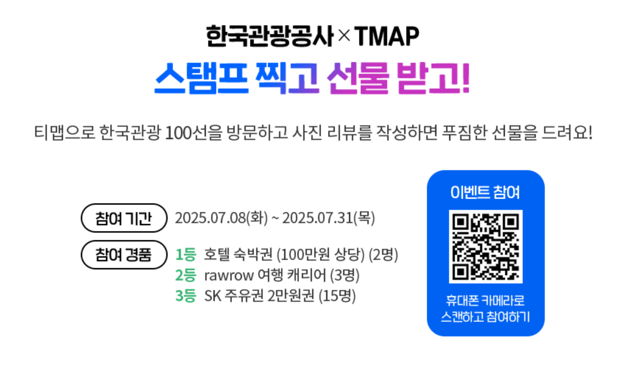 이번 이벤트는 2025년 7월 1일(화)부터 7월 31일(목) 밤 11시 59분까지 진행되며, 전국 6개 권역(수도권, 충청권, 강원권, 전라권, 경상권, 제주권)의 인기 관광지를 방문해 스탬프를 인증하면 참여할 수 있어요. 참여자들은 10만원 가족식사권, 5만원 주유권, 5천원 편의점 상품권 등 푸짐한 경품을 추첨을 통해 받을 기회를 얻습니다!