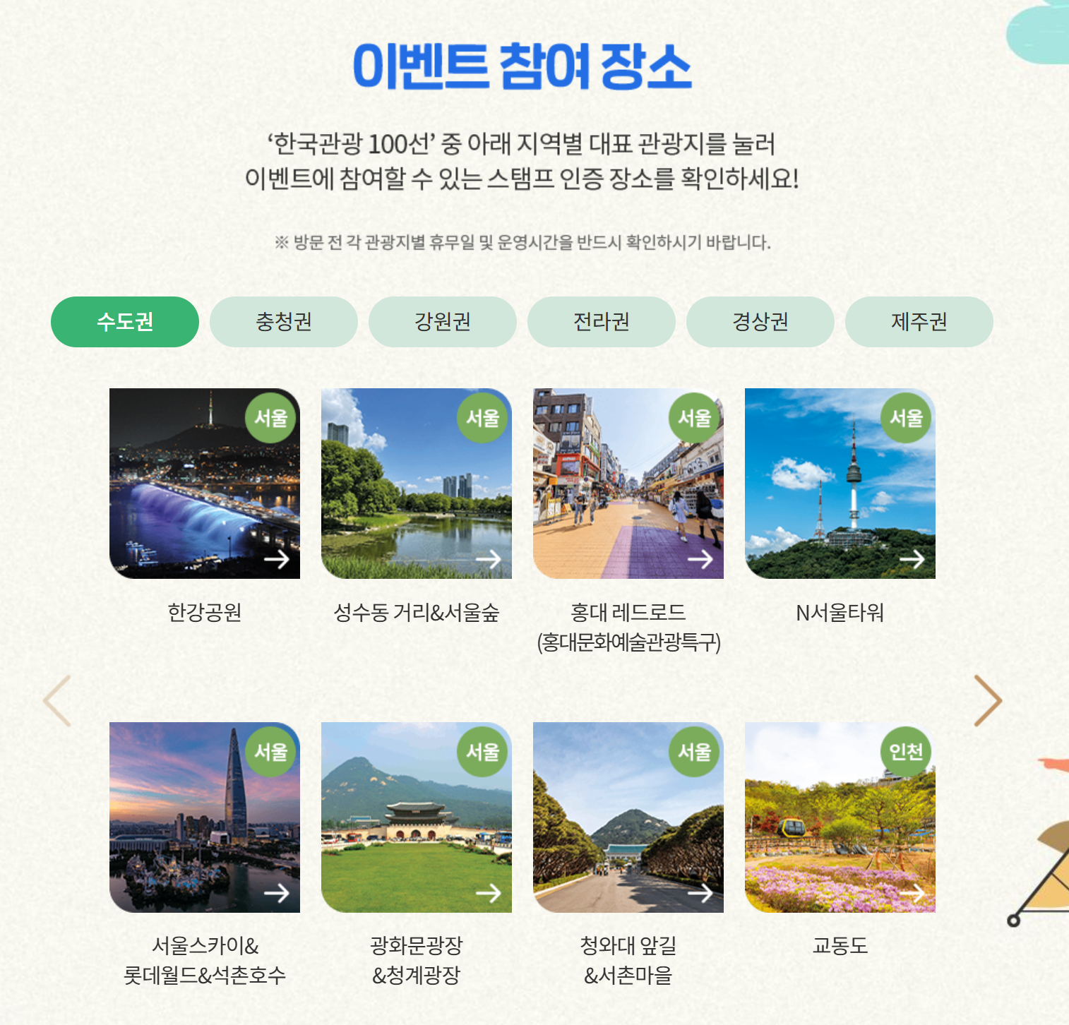 전국 6개 권역에서 선택할 수 있는 다채로운 관광지를 아래에 정리했어요. 각 지역별 대표 명소를 방문해 스탬프를 받아보세요!