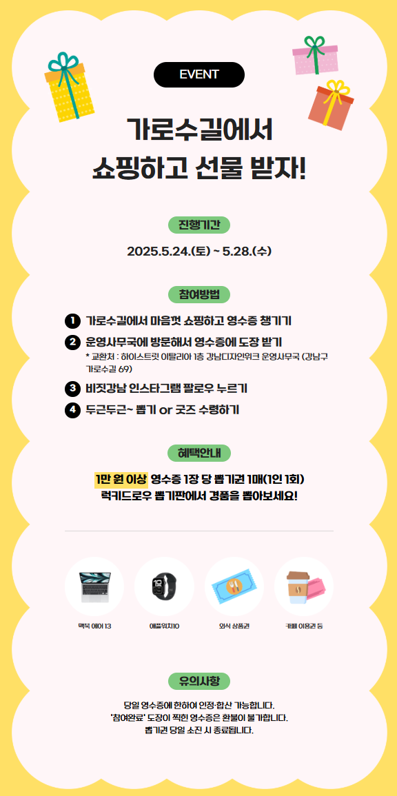 - 참여 방법: 가로수길에서 구매한 영수증을 하이스트릿 이탈리아 1층(가로수길 69)에서 인증하면 선물 증정